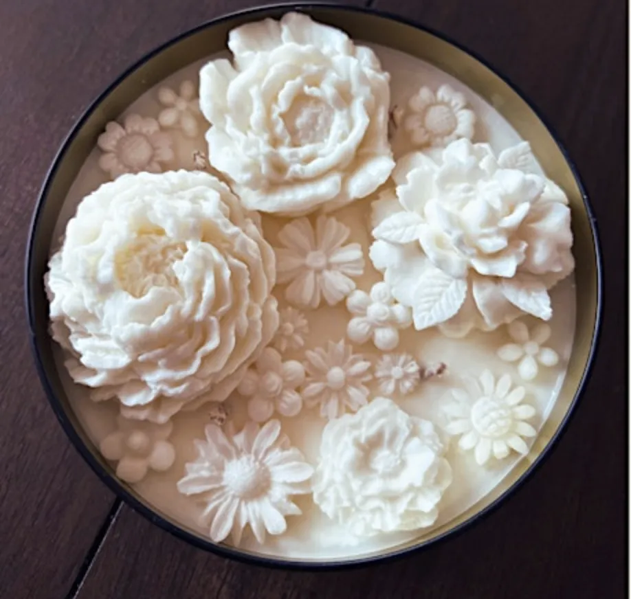 We’ll walk through the full process of filling the vessel with soy wax, adding fragrance oil, and then dive into the art of wax flower making using molds I’ll provide. Students will be able to experiment with two-tone color combinations to personalize their flowers. I’ll also explain the difference between the soy wax used for filling and the special blend used for sculpting the flowers.